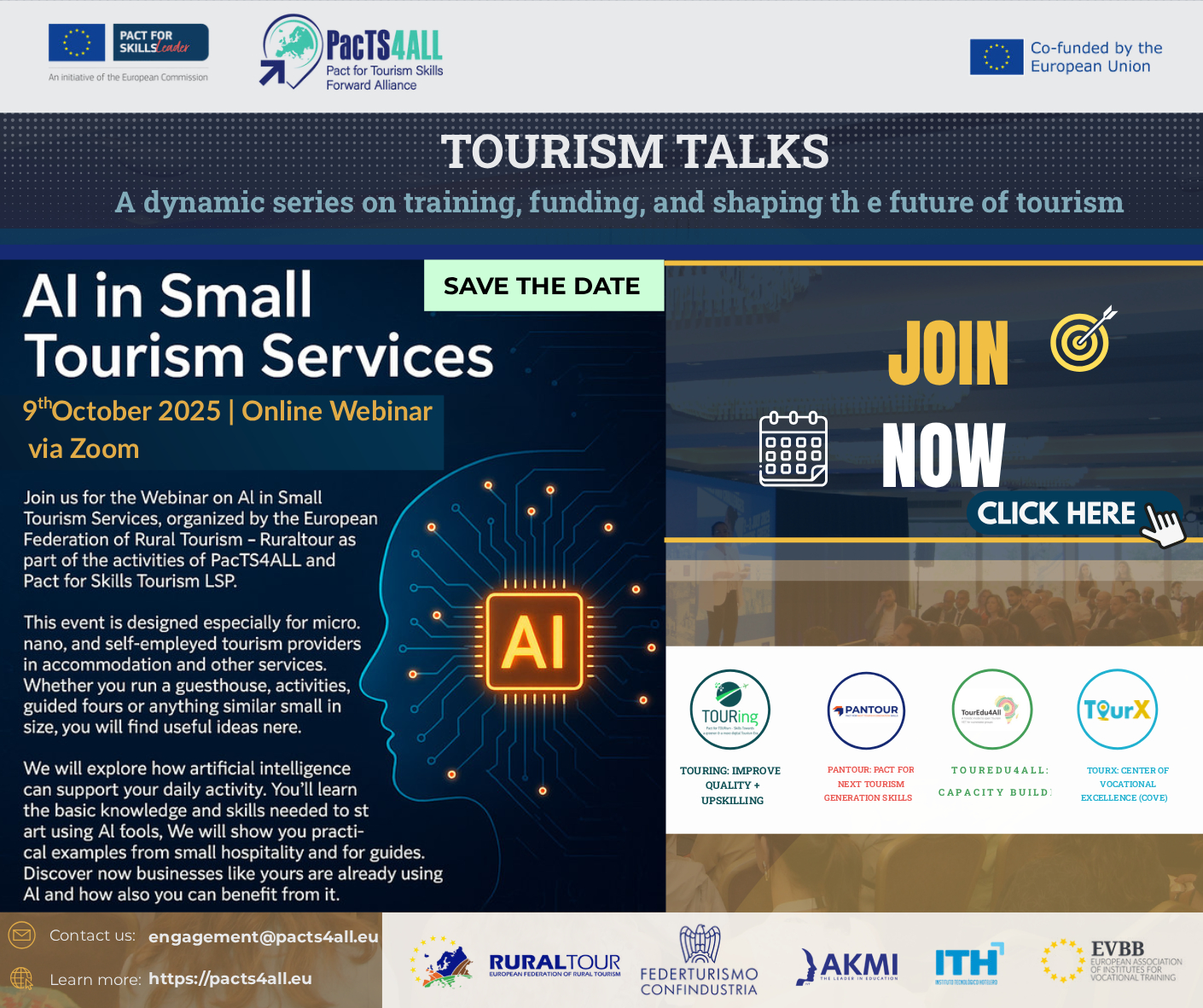 This webinar, organised by the European Federation of Rural Tourism – Ruraltour, is part of the activities of PacTS4ALL and the Pact for Skills Tourism LSP. Designed especially for micro, nano, and self-employed tourism providers in accommodation and related services, the session will explore how artificial intelligence can support daily operations. Participants will gain basic […]